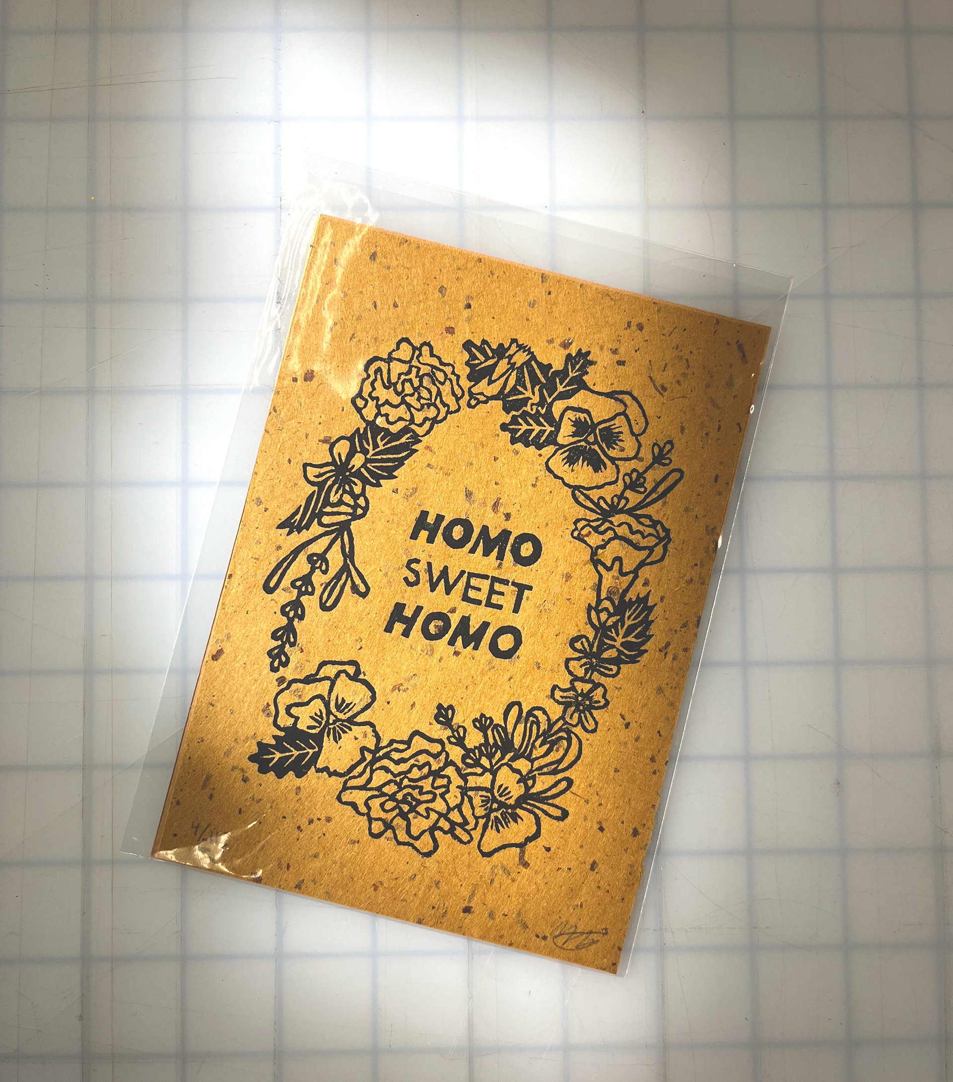 Homo Sweet Homo on amber speckle paper, 5 x 7"